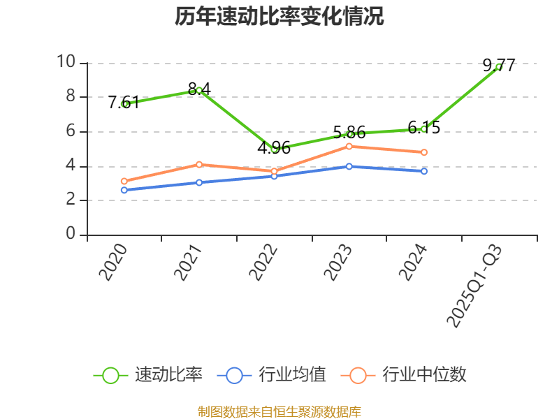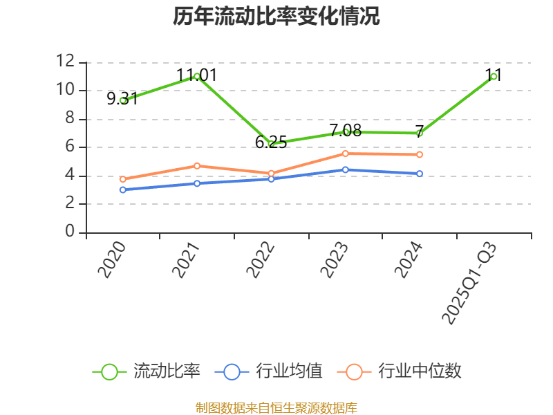 2025年前三季度,公司流动比率为11,速动比率为9.77。