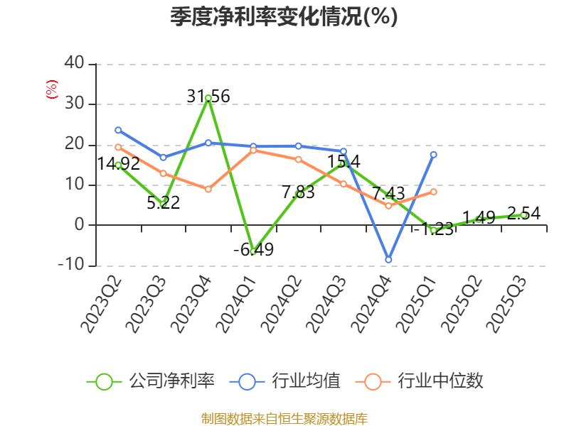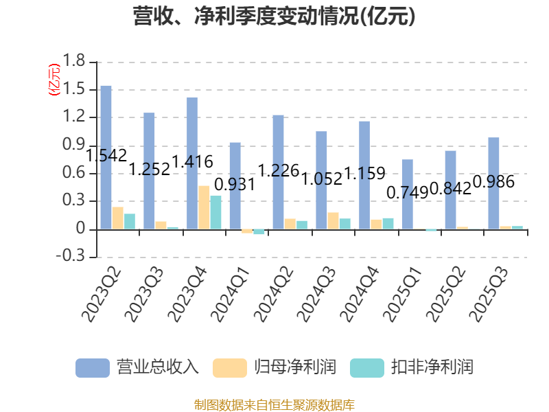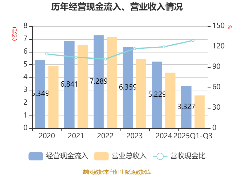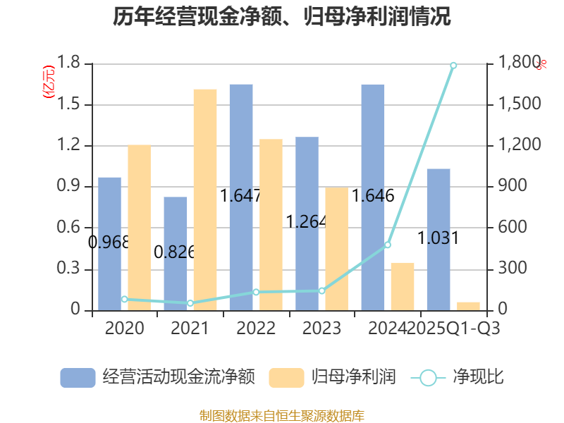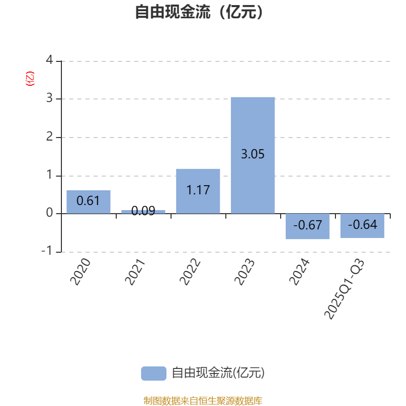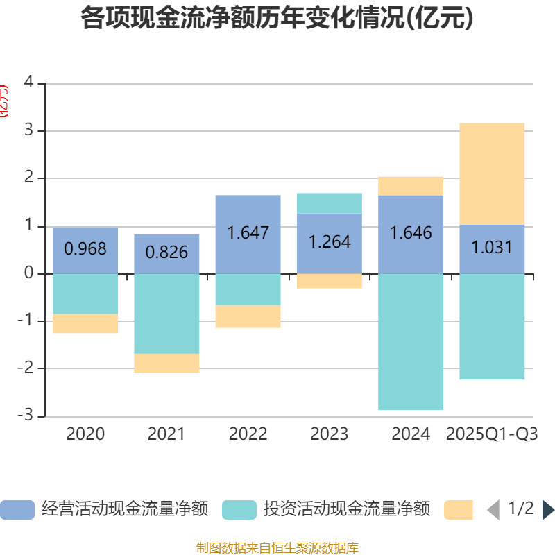 2025年前三季度,公司经营活动现金流净额为1.03亿元,同比下降7.3%;筹资活动现金流净额2.13亿元,同比增加1.92亿元;投资活动现金流净额-2.23亿元,上年同期为-2.43亿元。
